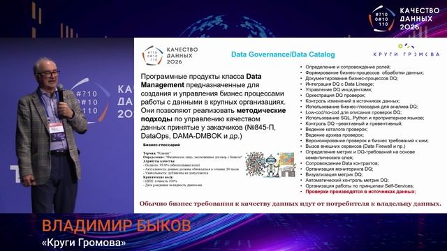 5 февраля 2026 года исследовательский центр «Круги Громова» принял участие в VII конференции «Качество данных» (Москва) — ключевом отраслевом событии России и СНГ, посвящённом Data Quality и Data Quality Management (DQM). Мероприятие, организованное издательством «Открытые системы», собрало более 300 ИТ-руководителей и представителей крупнейших компаний: Сбер, ВТБ, Газпромбанк, РЖД, Росгосстрах, Северсталь, Авито, hh.ru и других. В рамках доклада «Отечественный рынок решений для управления качеством данных» директор по развитию аналитического центра «Круги Громова» Владимир Быков рассказал: — о методологических подходах к управлению качеством данных — о сегментации российского рынка DQM-решений — о практиках внедрения Data Quality в enterprise-архитектуре — о роли Data Governance, MDM, BI, ETL и ML-платформ в обеспечении качества данных Принять участие в опросе зрелости Data Quality-практик в российском бизнесе можно по ссылке: https://russianbi.ru/ Отдельное внимание уделено системному подходу: управление качеством данных рассматривается не как набор проверок, а как непрерывный управляемый процесс внутри корпоративной архитектуры данных. В докладе разобраны: • драйверы внедрения DQM (регуляторика 152-ФЗ, 845-П, МСФО 17, GMP/ГОСТ, Data-Driven культура) • выбор между методологией и инструментами Data Quality • категории DQ-решений (Data Governance, Data Catalog, MDM, ETL/BI-контроль, Data Quality Firewall, ML-подготовка данных) • развитие Augmented Data Quality и AI/ML-подходов • интеграция DQ с Data Platform и Lakehouse • появление MCP-серверов в архитектуре управления качеством данных Также в видео представлен анонс исследования рынка Data Quality-платформ — сравнение российских решений по более чем 140 критериям. Видео будет полезно: архитекторам данных CDO и руководителям аналитики Data Engineers и BI-разработчикам специалистам Data Governance руководителям цифровой трансформации Ключевые темы: Data Quality, DQM, Data Governance, Data Catalog, MDM, DataOps, Data Platform, Lakehouse, BI, ETL, AI/ML, Augmented Data Quality, Enterprise Architecture, качество данных в корпоративных системах. #DataQuality #DQM #DataGovernance #DataCatalog #MDM #DataOps #Lakehouse #BI #ETL #AI #Analytics #DataManagement #КругиГромова Data Quality, DQM, Data Quality Management, управление качеством данных, качество данных, проверка данных, контроль качества данных, мониторинг качества данных, метрики качества данных, правила качества данных, Data Governance, управление данными, data governance framework, data governance maturity, Data Catalog, каталог данных, metadata management, управление метаданными, data lineage, происхождение данных, master data management, MDM, справочники, мастер-данные, data stewardship, data owner, data steward, data architect, data engineer, data analyst, CDO, data driven, data driven компания, data culture, культура данных, data management, управление корпоративными данными, корпоративная архитектура данных, enterprise data architecture, enterprise architecture, информационная архитектура, DataOps, data observability, observability данных, data monitoring, anomaly detection data, profiling данных, data profiling, очистка данных, data cleansing, стандартизация данных, нормализация данных, дедупликация данных, matching, data matching, enrichment данных, data enrichment, data validation, валидация данных, контроль справочников, golden record, единая версия правды, single source of truth, trusted data, reliable data, BI, бизнес-аналитика, аналитика данных, ETL, ELT, data integration, интеграция данных, ingestion данных, подготовка данных, data preparation, data platform, data warehouse, DWH, хранилище данных, lakehouse, data lake, корпоративное хранилище, аналитическая платформа, self service analytics, self service data, augmented data quality, AI data quality, ML data quality, machine learning data preparation, подготовка данных для ML, feature engineering, качество датасетов, synthetic data quality, MCP serv