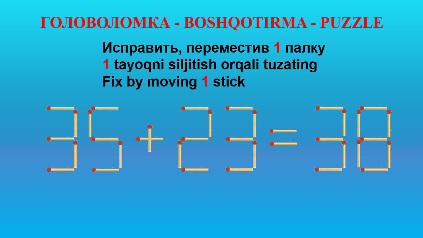 ГОЛОВОЛОМКА - BOSHQOTIRMA – PUZZLE. Спичка. 66+20=48, 63+25=90, 66-23=49, 35+23=38