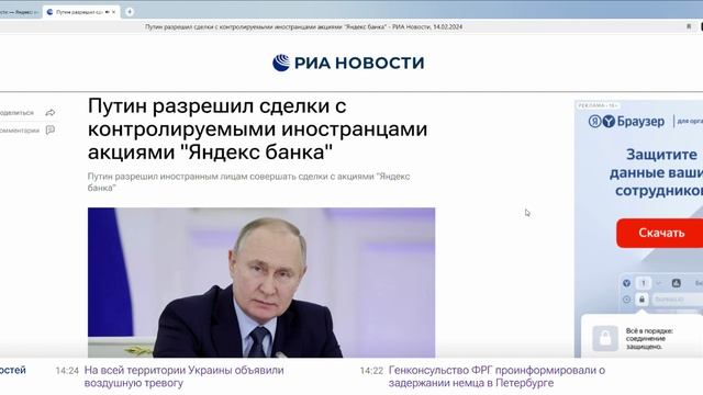 Путин разрешил сделки с контролируемыми иностранцами акциями _Яндекс банка_ - РИА Новости, 14.02.202
