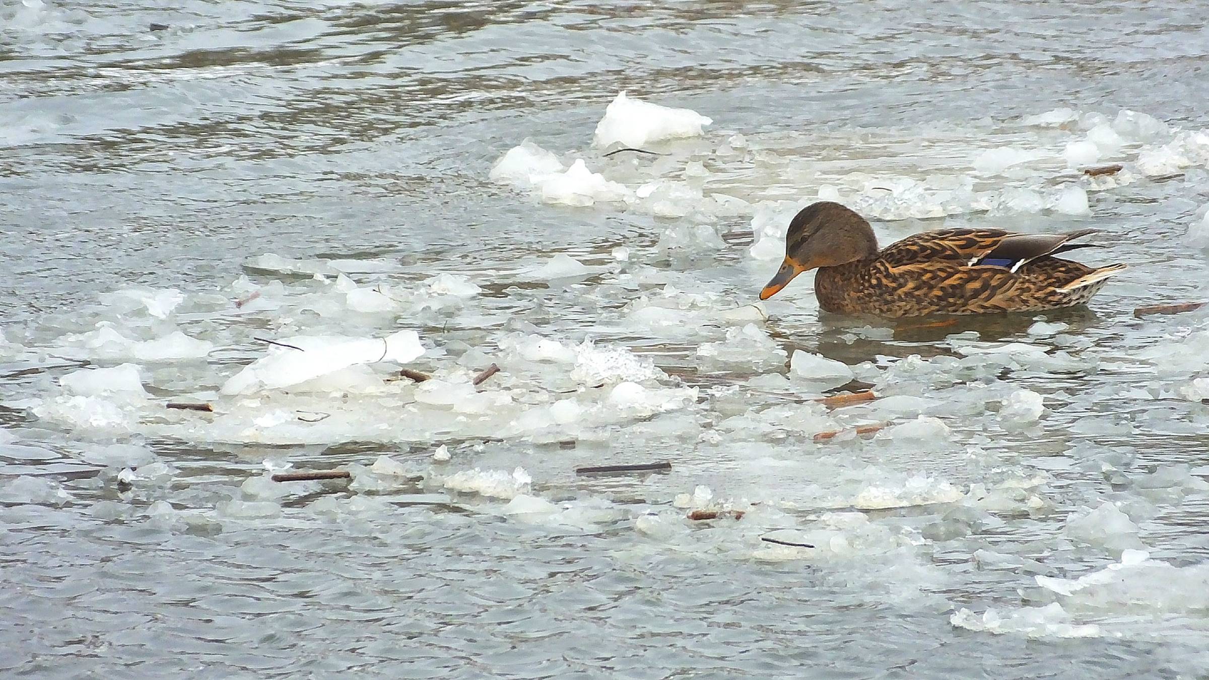 Начало ледохода. Небольшие льдины держатся у берегов. Подходя к затону правого берега, льдины попадают в водоворот. Этакий круг почёта.