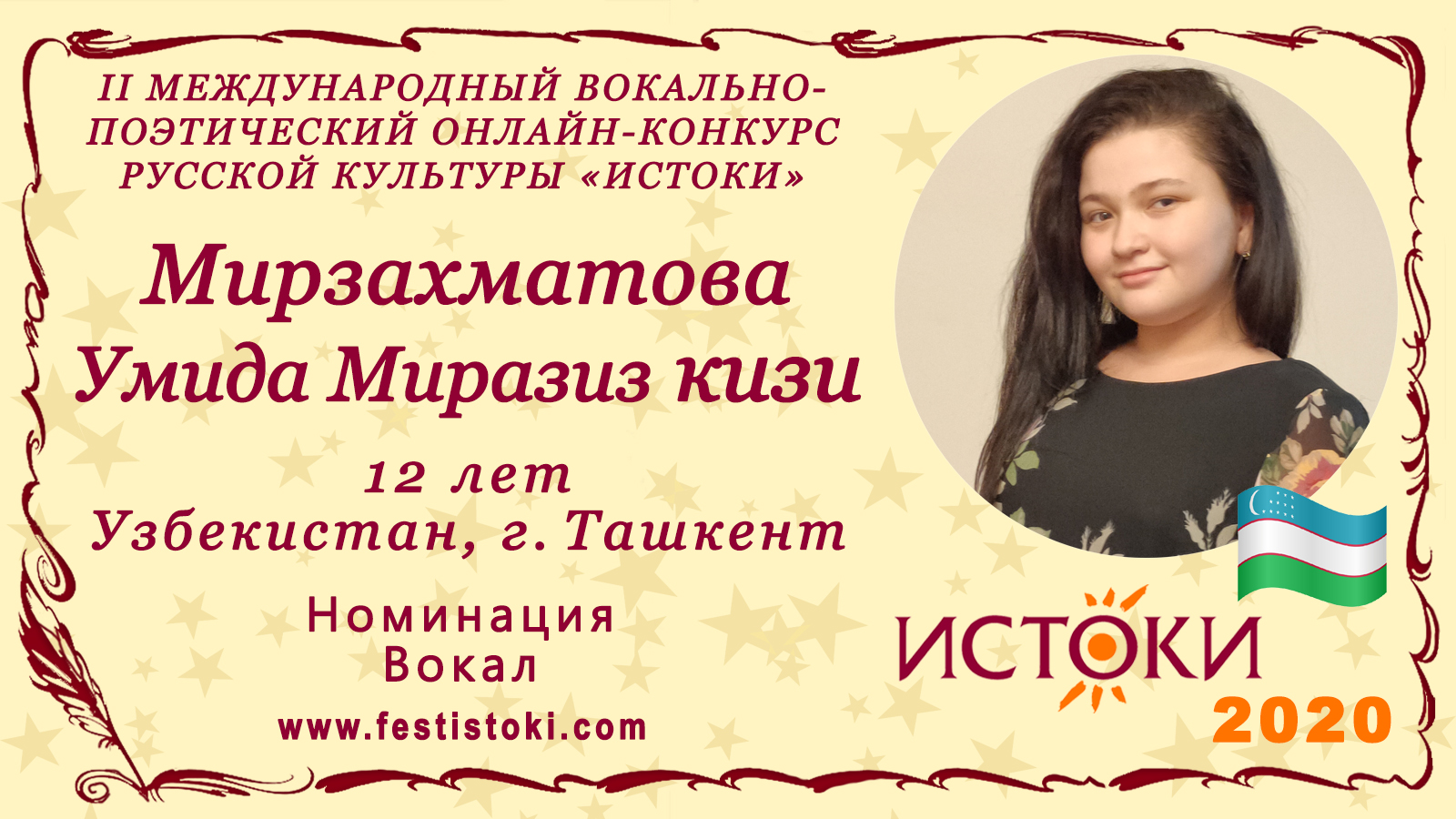 Лауреат III степени II Международного вокально-поэтического онлайн-конкурса русской культуры «Истоки». Номинация - Вокал. Песня "Родина" Автор песни неизвестен, композитор И. Иванов. Сайт: www.festistoki.ru / www.festistoki.com E-mail: festistoki@mail.ru