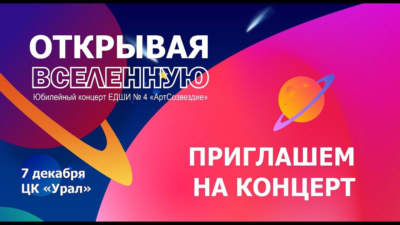 #АртСозвездие #юбилей #школаискусств #концерт ЭТО СОБЫТИЕ НЕЛЬЗЯ ПРОПУСТИТЬ! ЮБИЛЕЙ ШКОЛЫ - ЭТО НЕ ОБЫЧНЫЙ ПРАЗДНИК! Дорогие друзья! Мы будем рады видеть Вас на нашем юбилейном творческом событии «Открывая Вселенную», посвященном 40-летию МАУК ДО «Екатеринбургская детская школа искусств № 4 «АртСозвездие». В этот замечательный вечер вы сможете насладиться выступлениями лучших творческих коллективов и солистов школы. Ждём Вас 7 декабря 2023 г. в ЦК «Урал» (ул. Студенческая, 3). Начало мероприятия в 18:00 час.: 18.00 сбор гостей 18.15 работа концертных площадок и музея «Школа – моя история!» 19.00 начало гала-концерта Не упустите возможность погрузиться в волшебную атмосферу творчества и насладиться выступлениями юных талантов.