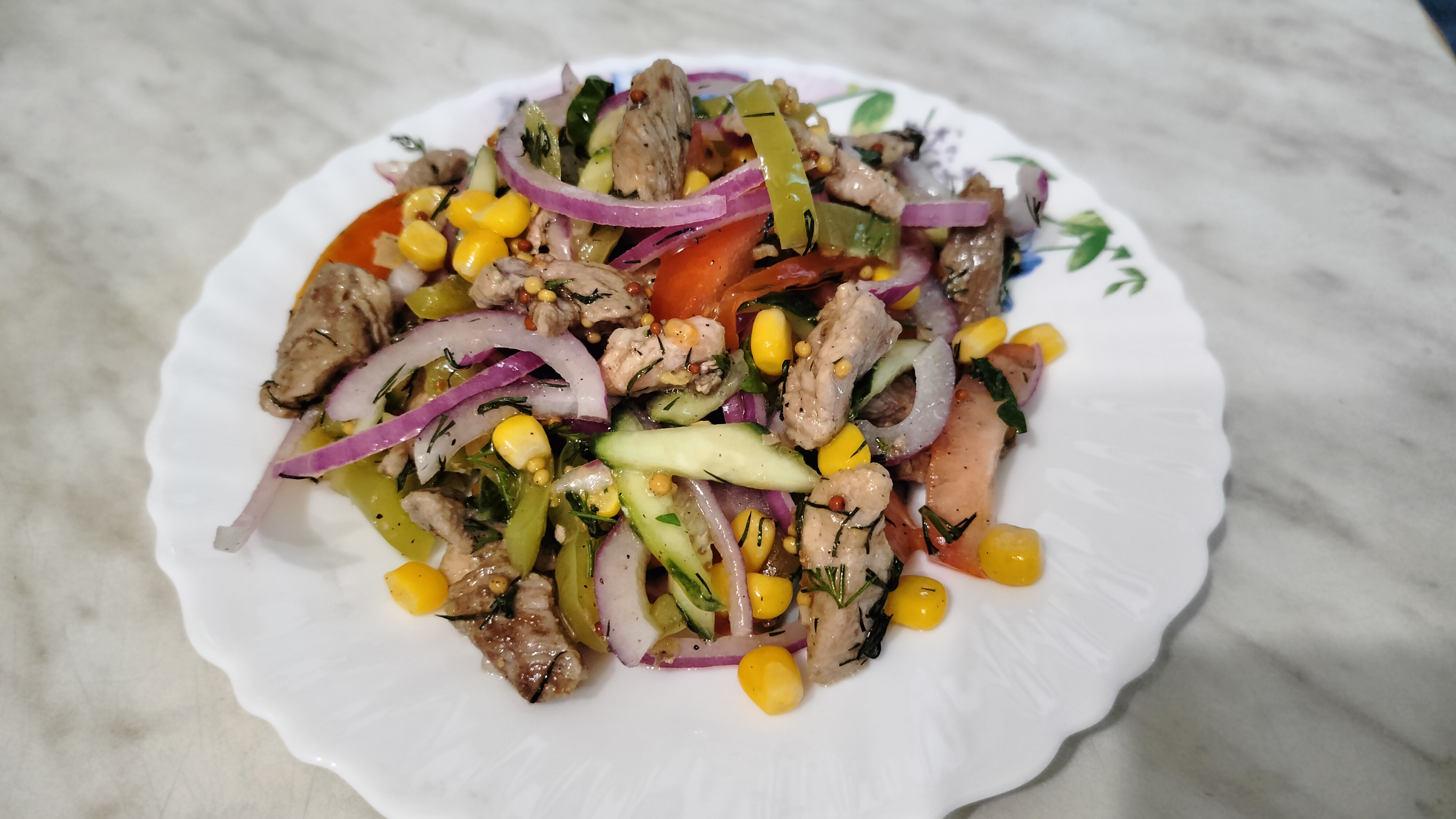 Вкуснейший салат "Сытный" готовиться быстро получается очень вкусным, сытным и ярким, подойдёт на все случаи жизни. Мясо (любое) Помидоры Огурцы Перец болгарский Лук красный Чеснок Масло растительное Кукуруза консервированная Горчица зернистая Соль Перец чёрный молотый Уксус 70% Сахар ПРИЯТНОГО АППЕТИТА ВСЕМ! #салат#салатыизакуски#еда#втоп#салаты#закуска#сытно#быстроивкусно