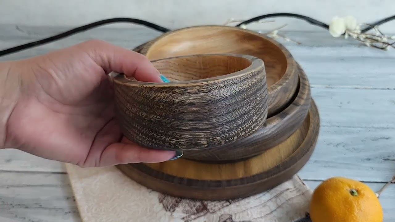 Столовый сервиз из дерева. Набор деревянной посуды для сервировки стола «Графит» из 5 предметов: поднос большой диаметр 29,5 см., высота 2,3 см., вес 765 гр.; поднос маленький диаметр 19 см., высота 2,3 см., вес 300 гр.; салатник большой диаметр 25 см., высота 4,5 см., вес 850 гр.; салатник маленький диаметр 20 см., высота 4,5 см., вес 600 гр.; соусник диаметр 11 см., высота 4,5 см., вес 200 гр. Общий вес 2700 гр. купить посуду из дерева можно в нашем магазине https://www.livemaster.ru/tvorcheskay-masterskaya-granat-mk?view=profile
