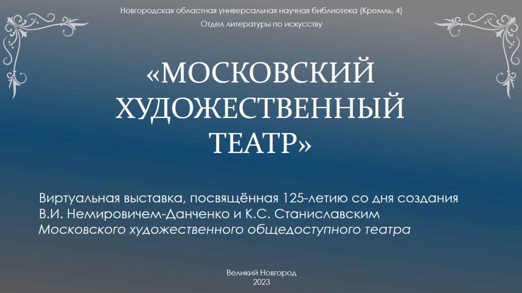 В 2023 году отмечается 125 лет со дня создания Московского Художественного театра имени А. П. Чехова. Изначально он назывался Московским Художественно-Общедоступным театром, его основали Константин Сергеевич Станиславский и Владимир Иванович Немирович-Данченко. В разное время им руководили Олег Ефремов и Олег Табаков, а его потенциала хватило для создания двух полноценных театров: Московского художественного театра им. А.П. Чехова и Московского художественного академического театра имени Максима Горького. Отдел литературы по искусству Новгородской областной универсальной научной библиотеки предлагает вашему вниманию виртуальную выставку «Московский художественный театр», на которой представлены материалы и иллюстрации, связанные с созданием Московского художественного театра, его преобразованиями, с его руководителями и наследием. Приятного просмотра! Справки по телефону: 8(8162)77-36-59, отдел литературы по искусству.