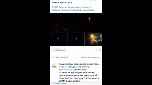 Ответ от администрации города Красногорска на сайте ВКонтакте по освещению