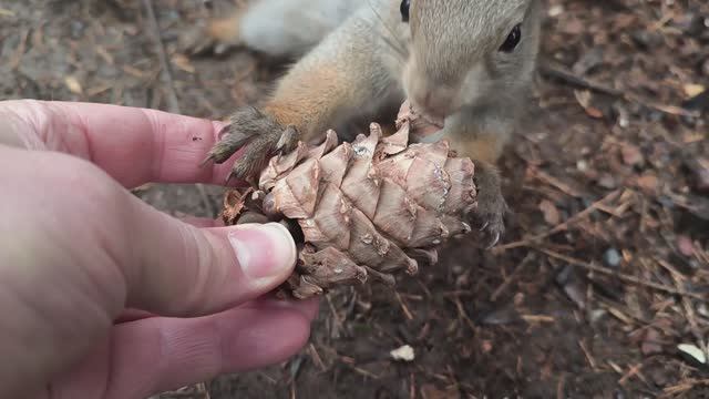 Белка забрала кедровую шишку