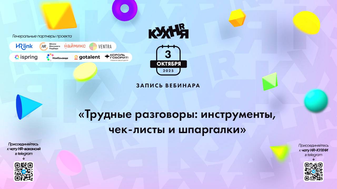 Присоединяйтесь к чатам и каналам HR-КУХНИ в телеграм: - Основной чат HR-КУХНИ в телеграм - https://t.me/+tYgAH0PgPQVkOWIy - Канал HR вакансий в телеграм - https://t.me/+CMNAN2u1hjo3M2Ri - Канал HR-EVENTS в телеграм - https://t.me/hr_kitchen - Канал HR JOURNAL в телеграм - https://t.me/hrkitchenjournal Полезные ссылки: - Каталог HR решений - https://hrkitchen.ru/exhibition - График конференций, бесплатных вебинаров, а также бесплатные курсы – https://hrkitchen.ru/ - Стать спикером HR-КУХНИ - https://hrkitchen.ru/speakers - Подписаться на полезную e-mail рассылку от HR-КУХНИ (новости, гайды, чек-листы, подарки от партнеров) - https://hrkitchen.ru/subscribe