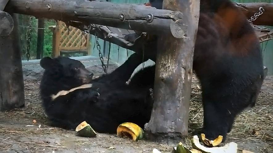 Медвежонок Фима хочет с Дусей поиграть и танцует от счастья, а Дуся хочет поесть тыкву.