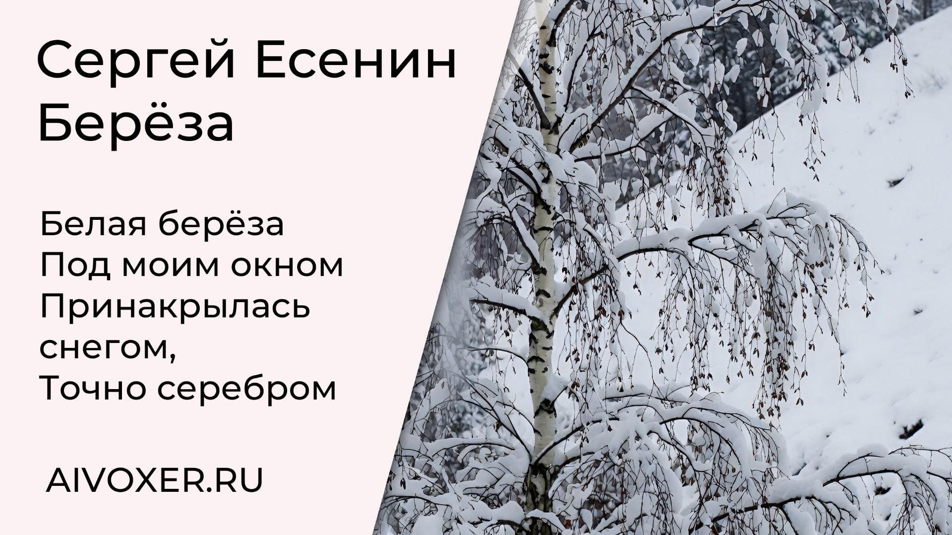 Сергей Есенин — Берёза. Стихотворение в новом музыкальном прочтении. Песня на стихи Есенина с полным сохранением авторского текста в куплетах. Оригинальная музыка и припевы. О чём эта версия? Мы привыкли, что поэт смотрит на берёзу. А что, если берёза смотрит на поэта? В куплетах — подлинный Есенин 1913 года. Снег, тишина, золотой огонь. Взгляд снизу вверх. В припевах, которые я дописал, всё переворачивается. Берёза видит тех, кто приходит к ней за вдохновением. И провожает их. Потому что поэты, как серёжки, рано или поздно отрываются от ветвей. «Сколько вас таких — СерЁженек-серёжек — оторвётся тихо от ветвей моих?» Это не озвучка под гитару. Это разговор через столетие. Между деревом и человеком. Между строкой и тишиной. Трек уже здесь Слушать: https://aivoxer.ru/track/bereza/ Текст песни: Белая берёза Под моим окном Принакрылась снегом, Точно серебром. Я гляжУ и вИжу: сколько вас таких СерЁженек-серЁжек Оторвётся тихо от ветвей моих? На пушистых ветках Снежною каймой Распустились кисти Белой бахромой. Я гляжУ и вИжу: сколько вас таких СерЁженек-серЁжек Оторвётся тихо от ветвей моих? И стоит берёза В сонной тишине, И горят снежинки В золотом огне. Я гляжУ и вИжу: сколько вас таких СерЁженек-серЁжек Оторвётся тихо от ветвей моих? А заря, лениво Обходя кругом, Обсыпает ветки Новым серебром. Я гляжУ и вИжу: сколько вас таких СерЁженек-серЁжек Оборвётся тихо от ветвей моих? Белая берёза в золотых огнях ВоспЕтая поэтом — серебром в веках Авторы: Стихи: Сергей Есенин (1913) Припевы, музыка, вокал, продакшн: AIVOXER
