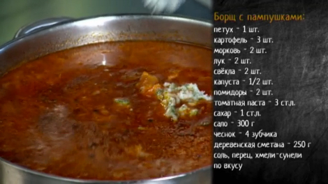 Как приготовить борщ с пампушками: Ингредиенты: Деревенский петух - 1 шт. Картофель – 3 шт. Морковь – 2 шт. Лук – 2 шт. Свекла – 2 шт. Капуста - 1/2 шт. Помидоры - 2 шт. Томатная паста - 3 ст.л. Хмели-сунели - по вкусу, добавлять не обязательно Сахар - 1 ст.л. Соль, перец - щепотка Сало - 400 г Чеснок - 4 зубчика Укроп - горсть Деревенская сметана жирная – 250 г Оливковое масло - 4 ст.л. Приготовление: 1. Поставить вариться петуха в кастрюлю полную воды с луковицей. Варить 1,5 часа. Достать петуха, остудить и разобрать. 2. Картошку порезать на кубики и бросить в бульон. Капусту нашинковать и бросить туда же. 3. На большой глубокой сковороде обжарить лук, морковь, помидоры. Добавить сахар и томатную пасту. На отдельной сковороде обжарить свеклу с лимонным соком, чтобы она сохранила цвет. Потушить и добавить это все в борщ. 4. Вернуть мясо петуха. Варить еще 5 минут. Перед тем как снять с огня, добавить в борщ 3-4 столовых ложки хорошей сметаны и сало, перетертое с чесноком. Подавать с пампушками. Пампушки: Ингредиенты: Готовое дрожжевое тесто - 500 г Чеснок - 3 зубчика Желток - 1 шт. Оливковое масло - 1 ст.л. Вода - 3 ст.л. Соль - щепотку Приготовление: 1. Отделить шарики теста размером 3 см, выложить на противень (на лист бумаги для выпечки) на расстоянии 1 см друг от друга, смазать желтком пополам с водой, выпекать в духовке до румяного цвета при температуре 180С. 2. Смазать смесью чесночного пюре, соли, масла и воды, дать постоять пару минут, подавать к борщу.