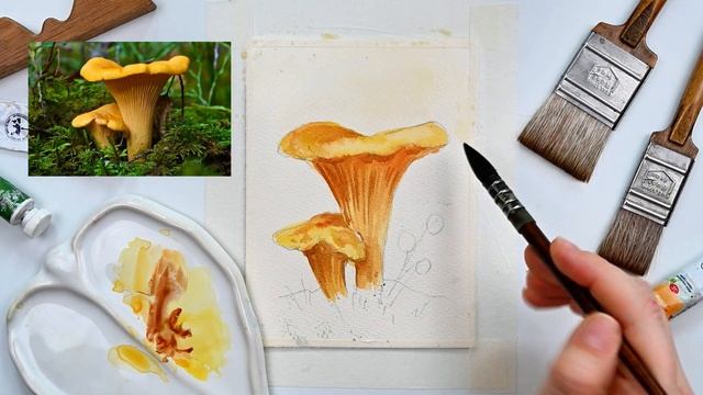 Рисуем грибы лисички акварелью за 15 минут вместе со шк