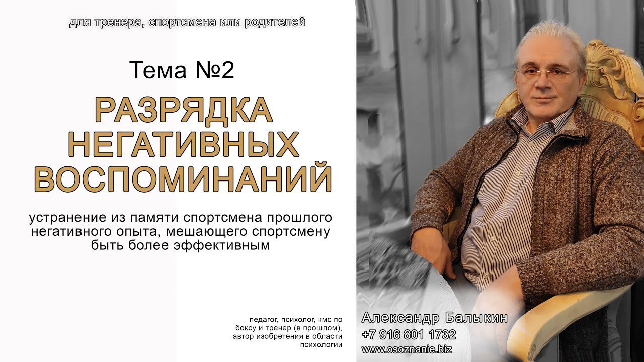 У спортсмена в его мозге постоянно накапливается негативный опыт от стрессов во время тренировок и соревнований. Этот опыт в дальнейшем еще больше мешает спортсмену выигрывать на соревнованиях. Видео о том, как находить и устранять отрицательный опыт, и тем самым становиться более успешным в тренировочно-соревновательной деятельности. ==================================================== Описание 10и встреч - в помощь тренеру, спортсмену и родителям. https://youtu.be/-m_gKbLFpLM Встреча 1 - Как эффективно управлять телом спортсмена. https://youtu.be/XDDZqd0acgk Встреча 2 - Как проводить психологическую коррекцию. https://youtu.be/BnnDLCcKtO8 Встреча 4 - Управление эмоциями спортсмена. https://youtu.be/rDe9ByUlGpA Встреча 5 - Как тренироваться меньше, но результат будет лучше. https://youtu.be/sNE3mtvm0tg Встреча 6 - Коммуникация в спорте. https://youtu.be/kvngIY2SL08 Встреча 7 - Тренировка внимания у спортсмена. https://youtu.be/N0LDICJF1nA Встреча 8 - Мотивация и стимуляция спортсмена. https://youtu.be/RfoKTJp7lV8 Встреча 9 - Конфликты в спорте. https://youtu.be/oDRczJlZMG8 Встреча 10 - Манипуляция в спорте - спортивная психология. https://youtu.be/521bm7kuueI --- подписаться на канал --- https://www.youtube.com/channel/UCjt1jQxBiZuBHK19P5VD2eQ Александр Балыкин - спортивный психолог +7 916 801 1732 ============================================== Видео семинаров по спортивной психологии - https://www.youtube.com/playlist?list=PLbNVCpO4w-QkZSP_MiMHns9xBPiNle6Lt