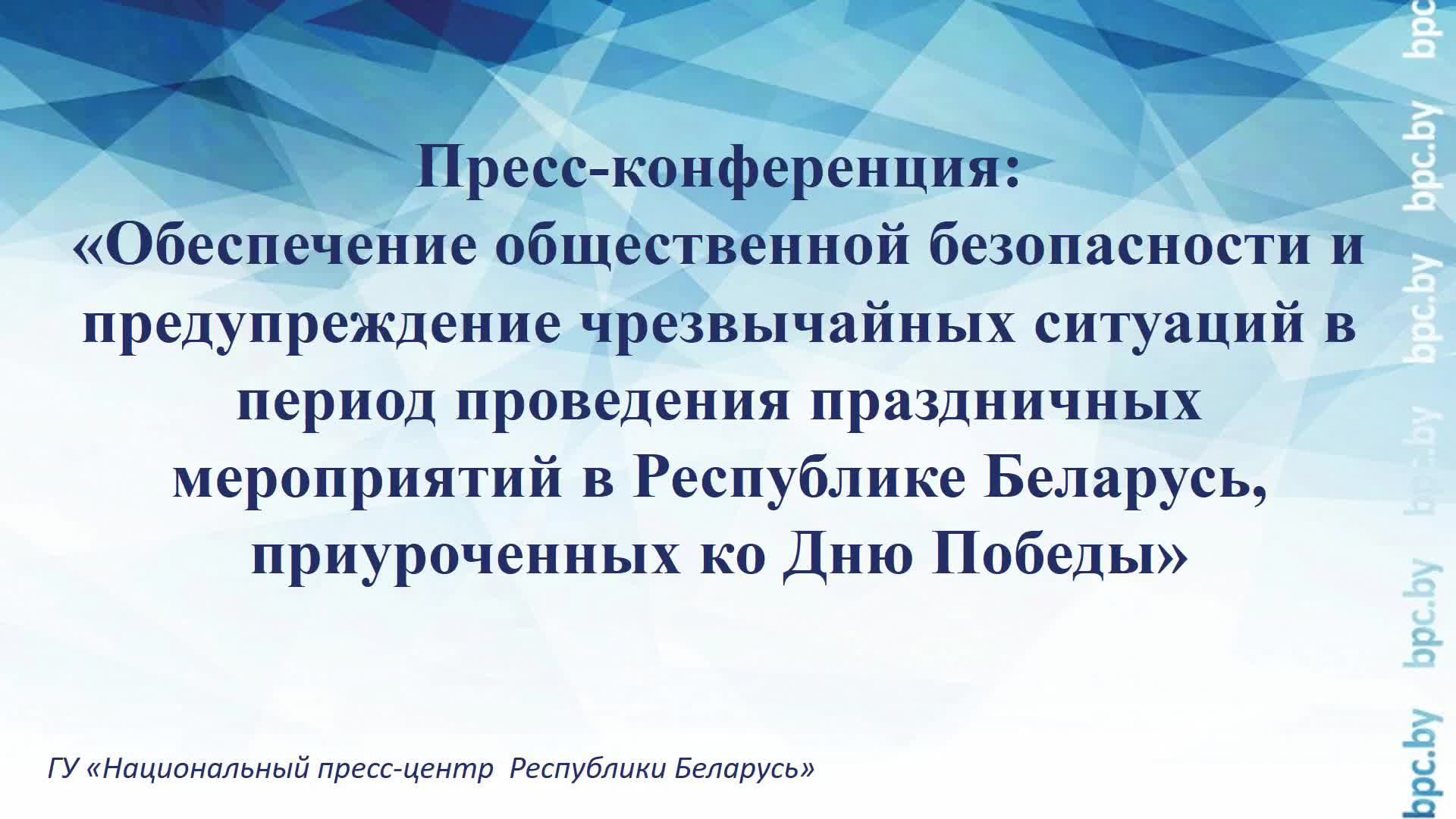 Пресс-конференция: «Обеспечение общественной безопасности и предупреждение чрезвычайных ситуаций в период проведения праздничных мероприятий в Республике Беларусь, приуроченных ко Дню Победы» Мирончик Сергей Сергеевич – заместитель начальника главного управления - начальник управления охраны правопорядка главного управления охраны правопорядка и профилактики милиции общественной безопасности МВД, Никитенко Егор Александрович – заместитель начальника управления аварийно-спасательных служб и объектовых подразделений Главного управления аварийно-спасательных служб и реагирования на чрезвычайные ситуации МЧС; Юдаков Евгений Юрьевич – врач скорой медицинской помощи, заведующий подстанцией № 11 УЗ «Городская станция скорой медицинской помощи» Задать вопрос: vopros@bpc.by Вся самая актуальная и оперативная информация о пресс-мероприятиях Национального пресс-центра Республики Беларусь будет публиковаться на нашем телеграм-канале. Подписывайтесь на нас: https://t.me/s/belpresscenter