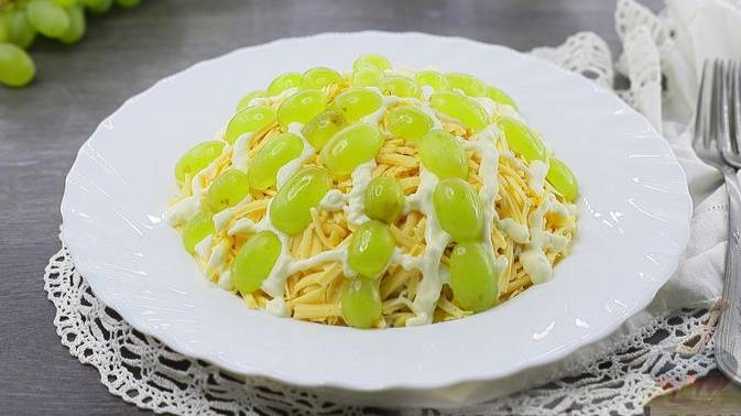 Аппетитный слоёный салат с курицей, сыром, яйцами и виноградом. Сочетание продуктов - довольно интересное: кисло-сладкие ягоды винограда, нежный натёртый сыр и варёная курица. Ингредиентов понадобится немного, а вкус получается весьма изысканным. #СалатСлоёный #СалатСКурицей #СалатСВиноградом #СалатыПраздничные