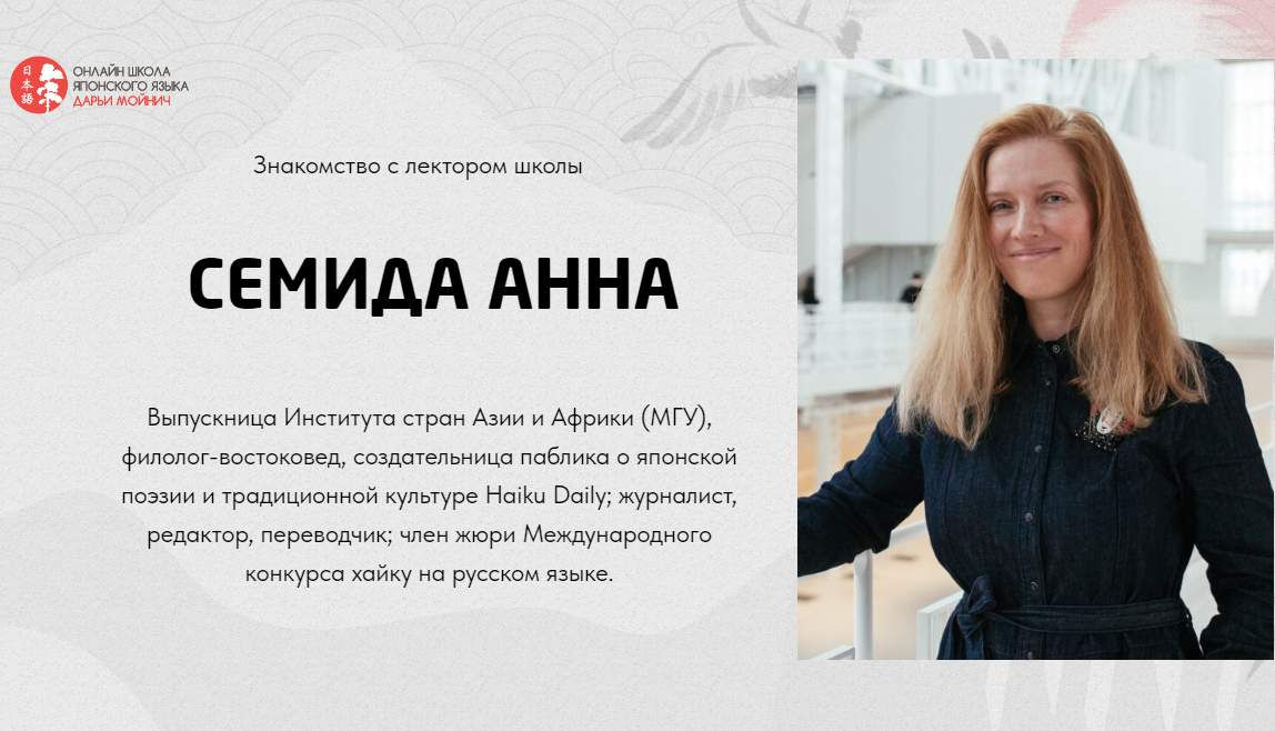 Записаться на бесплатную лекцию «Какой мы видим Японию и какая она на самом деле»: https://clck.ru/39ET7t Курс из 5 бесплатных уроков по культуре и истории Японии с известными японистами https://clck.ru/39ETAA Вы получите уникальный глубокий материал, которого не найдёте в открытом доступе и с пользой проведете время. Приветствуем вас в самой крупной в СНГ онлайн-школе японского языка, культуры и истории Японии Дарьи Мойнич. С 2012 года на онлайн-курсах Школы занимаются ученики от 12 до 65 лет из 15 стран мира. Наши преподаватели работают в лучших учебных заведениях Москвы, Санкт-Петербурга, Токио и Тель-Авива. Для нашей Школы они записали лекции на основе своих диссертаций, книг и научных трудов. Приглашаем вас отправиться вместе с нами в увлекательное виртуальное путешествие по Японии! Став частью нашего большого и дружного сообщества, вы познакомитесь с традициями и культурой Японии. И, конечно же, сможете выучить японский язык для себя, путешествий в Японию, общения с японцами, работы и учебы. Присоединяйтесь к нашему ТГ-каналу по ссылке ⤵️ https://t.me/+wt3k8nuNA2A2NzAy С любовью, онлайн-школа японского языка, истории и культуры Японии Дарьи Мойнич.