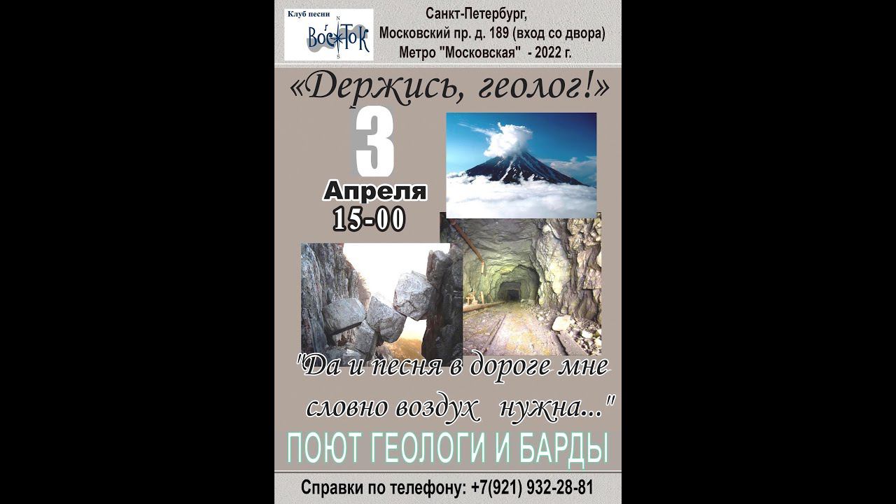 «Держись, геолог!..» «Да и песня в дороге мне словно воздух нужна...» Поют геологи и барды. Ведущая - Елена Демьянова-Семененко. 3 апреля 2022 г. Клуб песни «Восток». Санкт-Петербург, Московский пр., д. 189. Афиша, подбор фото- и видеоматериалов - Елена Демьянова-Семененко. Видеозапись - Николай Алфёров. Запись звука - Геннадий Демин. Монтаж - Алла Левитан.