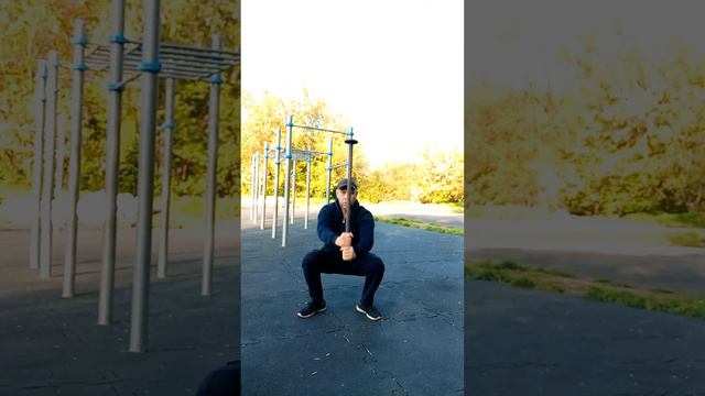 после зарядки-разминки-кардио 3 круга упражнений в сцепке 1. берпи - 3 2. с "булавой" за голову + присед 3. с "булавой" вращения по 5 пр/лев 4. турник подтягивания - 3 5. турник подъём ног к перекладине - 3