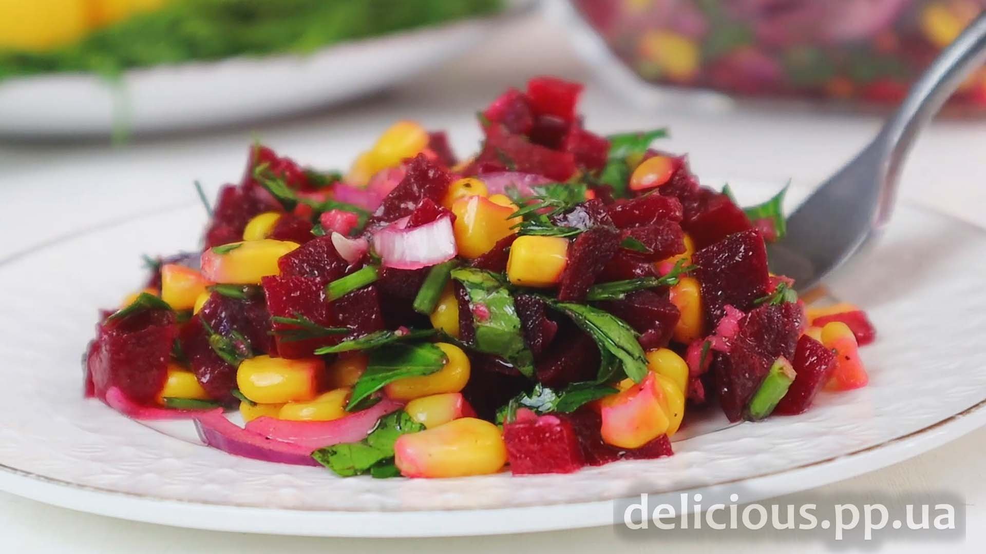 Легкий салат из свеклы с консервированной кукурузой.