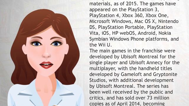 Assassin's Creed is a historical fiction action-adventure open world stealth video game series that consists of nine main games and a number of supporting materials, as of 2015. The games have appeared on the PlayStation 3, PlayStation 4, Xbox 360, Xbox One, Microsoft Windows, Mac OS X, Nintendo DS, PlayStation Portable, PlayStation Vita, iOS, HP webOS, Android, Nokia Symbian Windows Phone platforms, and the Wii U. Read more here: https://en.wikipedia.org/wiki/Assassin%27s_Creed Watch similar videos here: https://www.youtube.com/playlist?list=PLVTxyJV-b3NYw6At8S60RUKvmUcAoU3ji See more from Wiki Videos: https://www.youtube.com/channel/UC9pZsh1JbkZDC1LiwOHjwuQ/feed Follow us on Facebook : https://www.facebook.com/WikiVideoProductions Follow us on Twitter : https://twitter.com/VideosWiki Our Website : www.wvprod.com This video is the sole and exclusive property of WV Production Limited. WikiVideos and all related characters and elements are trademarks of and © 2015 WV Production Limited. All rights reserved.