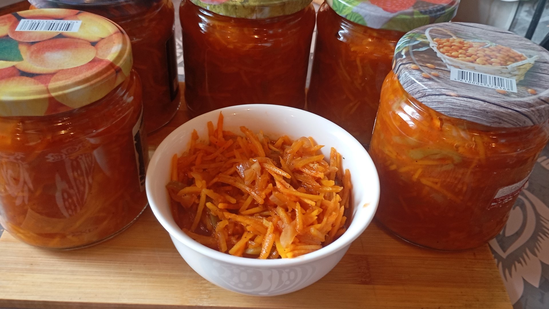 Ингредиенты: морковь - 1,2 кг. перец болгарский сладкий - 300 гр. лук - 600 гр. томатный сок - 1 литр сахар - 150 гр. соль - 70 гр. перец черный молотый - 1 ч.л. уксус 9% - 100 мл. масло растительное - 40 мл. Салат выложить в стерилизованные банки,закатать,перевернуть , укутать одеялом до остывания. Хранить продукцию в прохладном месте. Всем желаю хороших заготовочек на зиму!🙋 Не забудьте подписаться на канал ✔️✔️✔️, поставить 👍👍👍 пишите свои комментарии, пожелания,в переди ещё много интересного 🙋