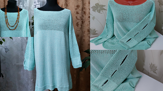 Туника связана на машине Каскад. Отделка крючком. Размер 52-54. расход пряжи 500 гр. Пряжа пехорка Жемчужная. Цвет 411 - мята. Длина нити 425 метров в 100 грамм