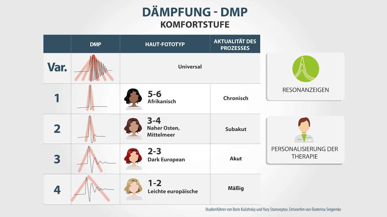 Das Protokoll zur Auswahl der Parameter beinhaltet die Verwendung einer starken Stimulation. Durch Ändern der "Schärfe" des Pulses ist es möglich, die Behandlung mit hoher Energie angenehmer zu gestalten. Außerdem wird die alternierende Dämpfung in Kombination mit der Frequenzmodulation in den digitalen Techniken der systemischen Therapie verwendet.