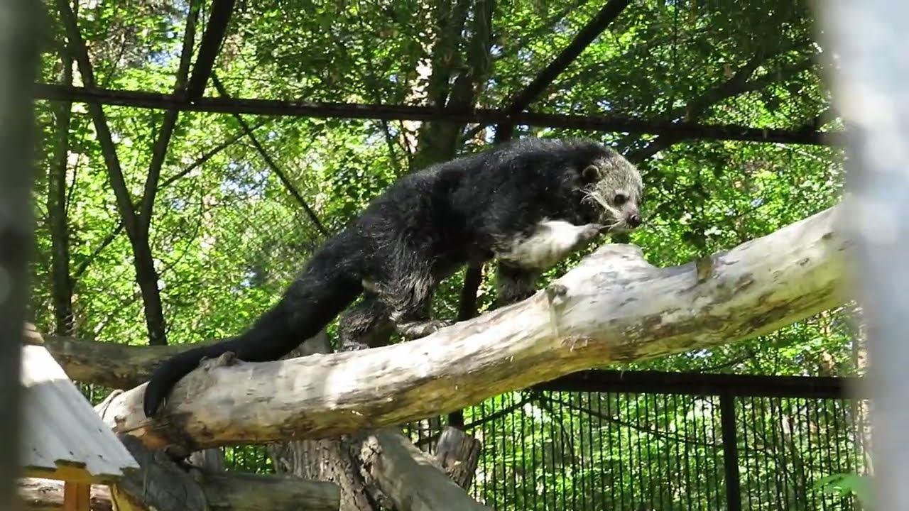Впервые этого зверька зоопарк получил из Берлина в 2010 году. Через два года самцу подобрали пару. Самку привезли из Ташкентского зоопарка. Бинтуронг — млекопитающее семейства виверровых отряда хищных, единственный вид монотипного рода Бинтуронги. Из-за внешнего сходства ранее причислялся к семейству енотовых, однако на самом деле является своеобразным по своей форме видом виверровых. Неуклюжие и коротконогие животные, зачастую туристы их называют «кошачьими медведями» из-за внешнего сходства строения тела с кошачьими и манерой передвижения по земле как у медведя. Бинтуронги выделяют запах, похожий на запах попкорна. Бинтуронги активны по ночам и живут в основном на деревьях. они хорошие пловцы и ныряльщики.