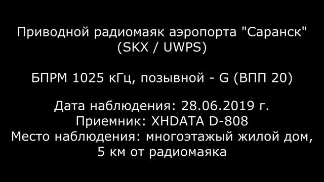Приводной радиомаяк аэропорта "Саранск" (SKX / UWPS). БПРМ 1025 кГц, позывной - G (ВПП 20). Дата наблюдения: 28.06.2019 г. Приемники: TECSUN PL-660, XHDATA D-808. Место наблюдения: многоэтажый жилой дом, 5 км от радиомаяка.