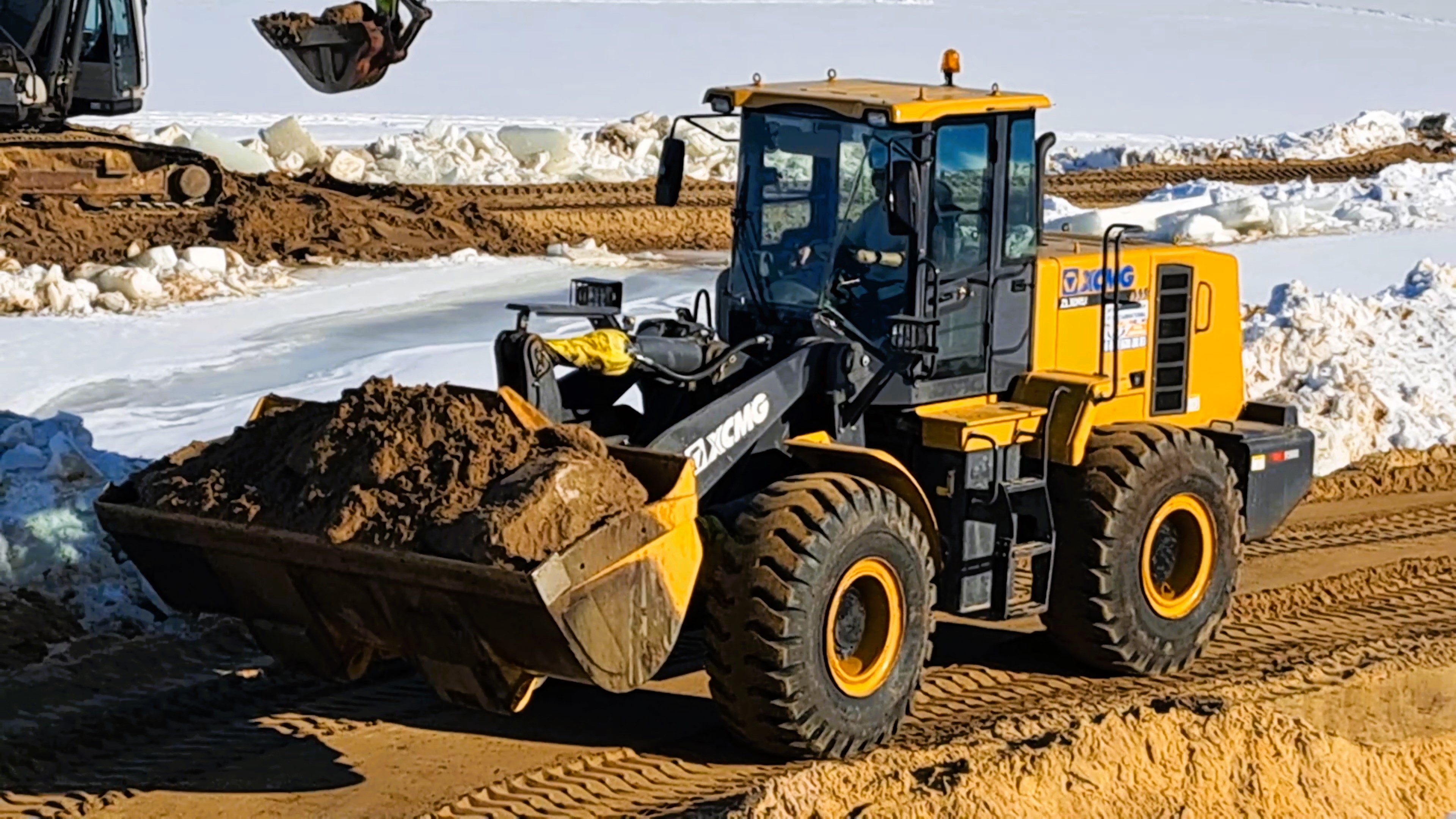 Экскаватор загружает песок в ковшик погрузчику