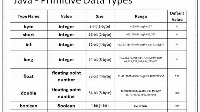 Java - Primitive Data Types Primitive types in Java include integer types, floating-point numbers, UTF-16 code units and a boolean type. There are no unsigned types in Java except char type, which is used to represent UTF-16 code units. The lack of unsigned types is offset by introducing unsigned right shift operation, which is not present in C++. A primitive type is predefined by the language and it is a reserved keyword. The eight primitive data types supported by the Java language are these: byte: The byte data type is an 8-bit signed two's complement integer. It has a minimum value of -128 and a maximum value of 127 inclusive. short: The short data type is a 16-bit signed two's complement integer. It has a minimum value of -32,768 and a maximum value of 32,767 inclusive. int: The int data type is a 32-bit signed two's complement integer. Int can hold integers only and not double unlike double can hold integers. Int x = 55; double y= 65.9; double: The double data type is for holding decimal values. Ex. Double x = 2.6, double y=6 :this is valid as 6=6.0 long: The long data type is a 64-bit two's complement integer. Use this data type when you need a range of values wider than those provided by int. float: The float data type is a single-precision 32-bit IEEE 754 floating point. As with the recommendations for byte and short, use a float (instead of double) if you need to save memory. boolean: The boolean data type has only two possible values: true and false. Use this data type for simple flags that track true/false conditions. This data type represents one bit of information. char: The char data type is a single 16-bit Unicode character, that holds a single character ex. single letter, number, or symbol. For example, 'apple' is a character, so is '1' and '&'. Those are all characters. watch single quotes for char value. This is different from Strings which must have double quotes. Like String city = “Singapore” The Java language also provides support for strings via the java.lang.String class. String: Use double quotes to convert a character string to new String object; for example, String str = “be good and god"; Java string is an object to represent array of char (character)
