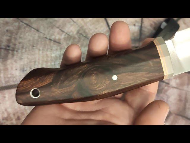 Нож из порошковой стали Nitrobe 77, 61-63 HRC с крио - Азотистая нержавейка, 0,10% углерода, 0,9% азота, 14,5% хрома, 3% молибдена, 0,1% ванадия и 0,5 ниобия и по отзывам сталь имеет очень высокие показатели. Создана специально для ножей. Из известных мастеров с ней работал Дес Хорн, который провозгласил её лучшей ножевой сталью всех времён. Данная сталь практически не имеет углерода (0,1%), который был заменен азотом на уровне 0,9%. Она не ржавеет и нож можно положить в посудомоечную машину. Наиболее впечатляющей особенностью стали NITROBE 77 является ее 'суперрезучесть' из-за меньшего размера молекул, чем в стали RWL-34. Рукоять ножа выполнена из Аризонского железного дерева с отделкой титаном . Клинок 140*38*3.8 мм, рукоять 130*22 мм, Клинок не заточен.Не является ХО , подпальцевая выемка менее 4мм.