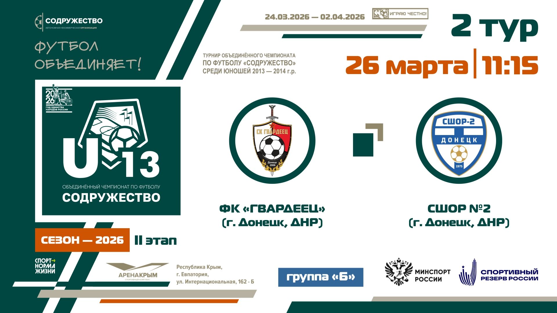 2 ТУР [Группа Б] | ФК «Гвардеец» (г. Донецк, ДНР) - СШОР №2 (г. Донецк, ДНР) | 26.03.2026