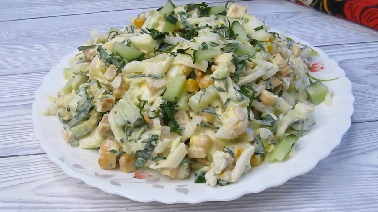 Салат отличается простотой приготовления и достаточно доступным набором ингредиентов, которые имеются практически в каждом холодильнике. Курица делает салат сытным, кукуруза придает интересную нотку. Рецепт: Капуста пекинская - 150 гр Куриное филе - 200 гр Яйца - 2-3 шт Огурец - 1 шт Кукуруза консервированная - 3 ст.л Зелень Соль, перец по вкусу Майонез - 3 ст.л