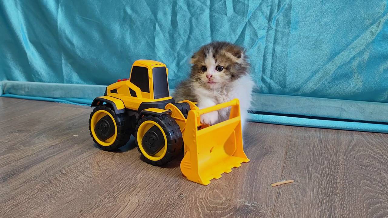 Котенок и желтый трактор. Первая встреча с рыжим котом.