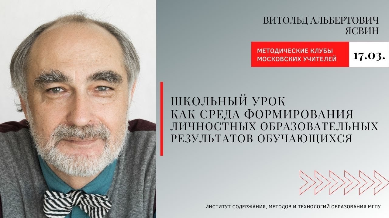 Витольд Альбертович Ясвин, доктор психологических наук, доктор педагогических наук, профессор, лауреат Премии Правительства РФ в области образования, заведующий межфакультетской кафедрой образовательных систем и педагогических технологий МГИМО МИД РФ Тема: "Школьный урок как среда формирования личностных образовательных результатов обучающихся"