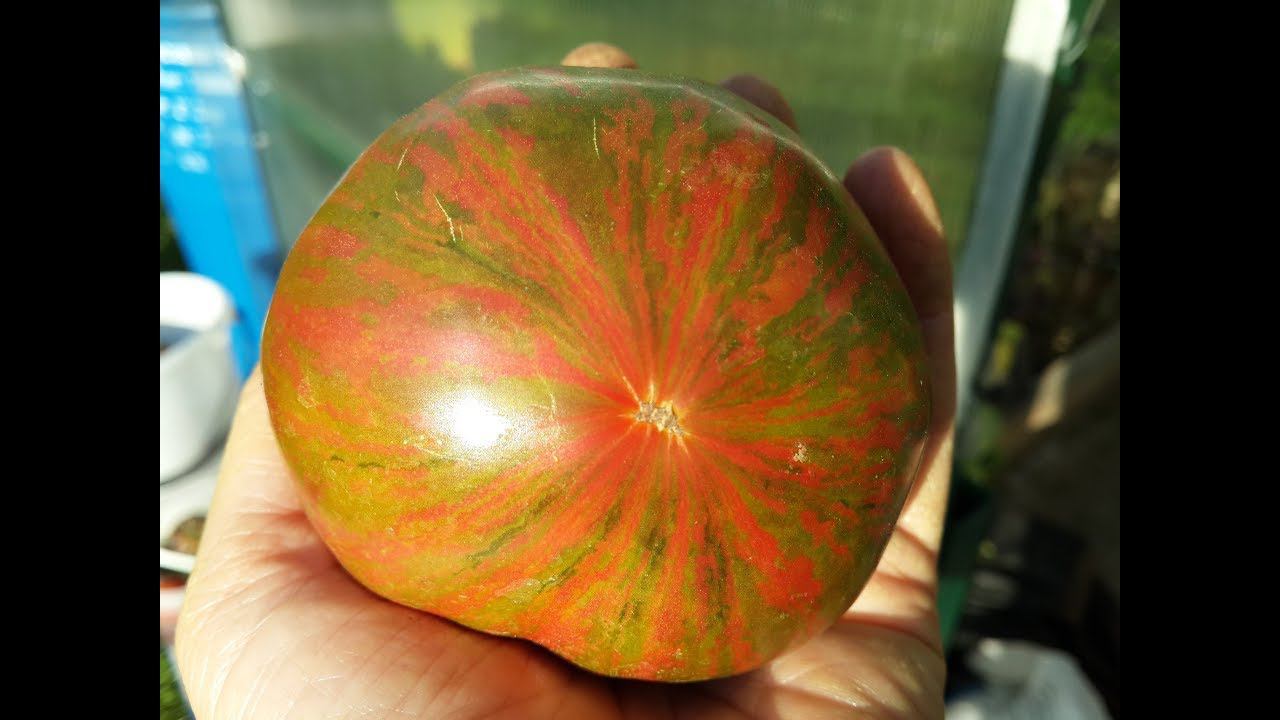 Высокорослый среднеспелый томат с крупными плоскоокруглыми плодами, красно- малинового цвета с зелеными полосками. Томат на разрезе многоцветный. Куст крепкий, но нуждается в пасынковании и подвязывании. В кистях собрано по 3-5 завязей. В теплице вырастает до 2м. Ananas Zebra Одно растение в теплице дало 2,900 кг