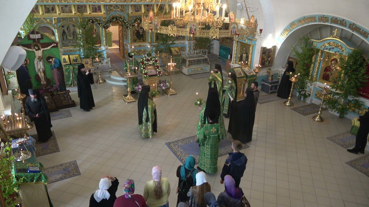 Праздничное богослужение на праздник Пятидесятницы имеет древние корни. Христианское празднование Сошествия Святого Духа на учеников Иисуса Христа известно с апостольских времен. По традиции ветхозаветной Церкви православные храмы на праздник Пресвятой Троицы украшаются березовыми ветками, цветами и свежескошенной травой. Таким образом, и храмы Крыпецкого монастыря были украшены зеленью и молодыми березовыми деревцами. 11 июня 2022 года в 18 часов праздничное богослужение прошло в Успенском храме. Вся служба была посвящена исключительно празднику Пятидесятницы: воскресные песнопения отменялись. Всенощное бдение с литией и полиелеем служил иеромонах Всеволод со служащей братией