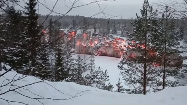 Республика Карелия. Горный парк "Рускеала", ранний зимний вечер, подсветка скал Большого Каньона.