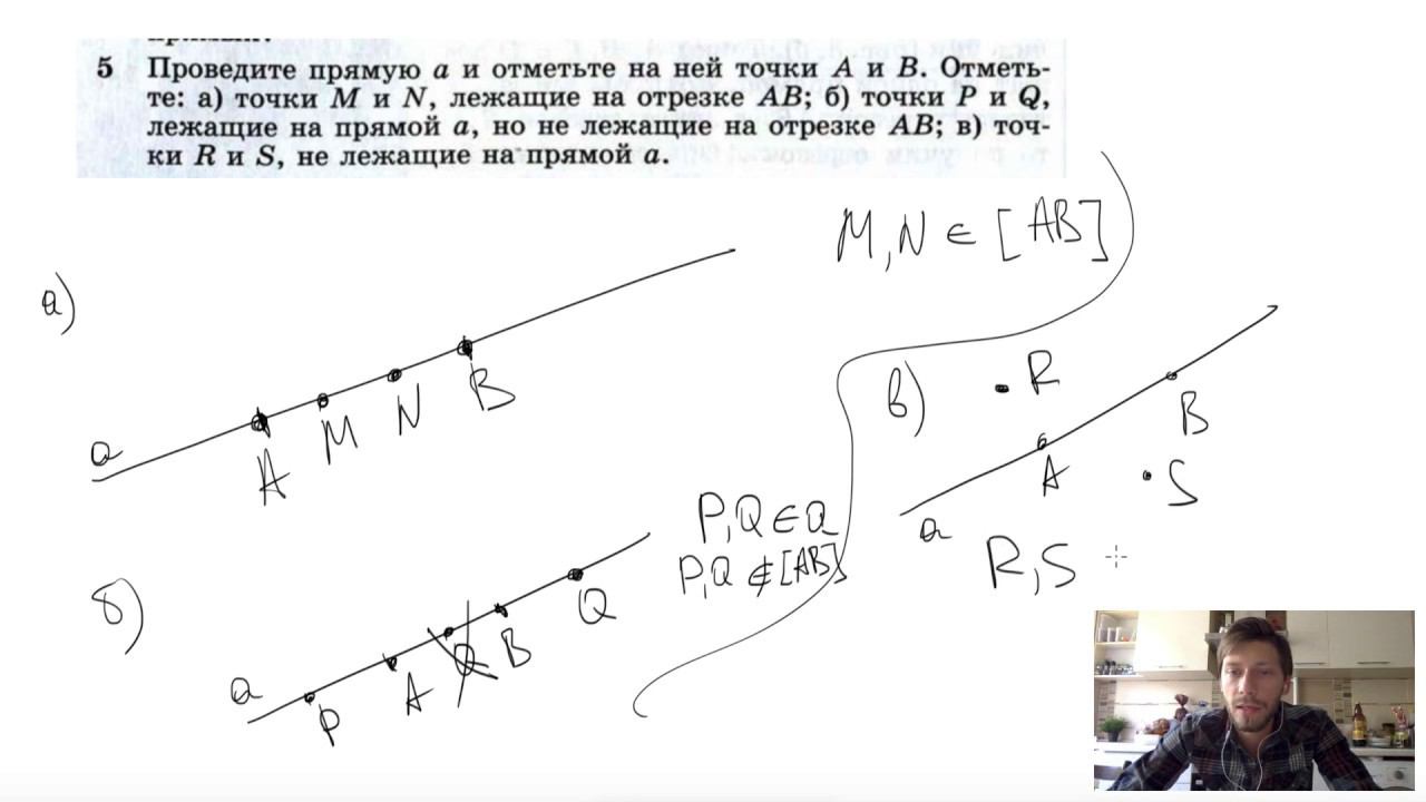 №5. Проведите прямую а и отметьте на ней точки А и В . Отметьте : а) точки М и N , лежащие на отрезке АВ ; б) точки P и Q , лежащие на прямой а , но не лежащие на отрезке АВ ; в) точки R и S , не лежащие на прямой а. Мой второй канал для подготовки к ЕГЭ и ОГЭ - https://www.youtube.com/ЕвгенийСумин Инстаграм - https://www.instagram.com/EGE_OGE.math VK - https://vk.com/evgeniysumin FB - https://www.facebook.com/EvgeniySumin
