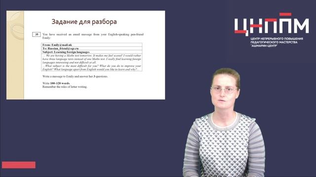 В очередном выпуске республиканского проекта «Учимся вместе на все 100» учитель английского языка гимназии № 4 г. Чебоксары, эксперт по проверке ОГЭ и ЕГЭ по английскому языку по Чувашской Республике Матвеева Елена Олеговна расскажет учащимся как писать письменную часть ОГЭ и разберет выполненное задание на примере одного из писем. По итогам занятия Елена Олеговна рекомендует: 1. При подготовке рекомендуется обращаться к сайту ФГБНУ «Федеральный институт педагогических измерений», где есть все необходимые материалы; 2. Требований к написанию письма достаточно много, их необходимо соблюдать для получения максимального балла; 3. Чем больше вы напишете тренировочных писем, тем спокойнее и увереннее вы будете себя чувствовать на экзамене.