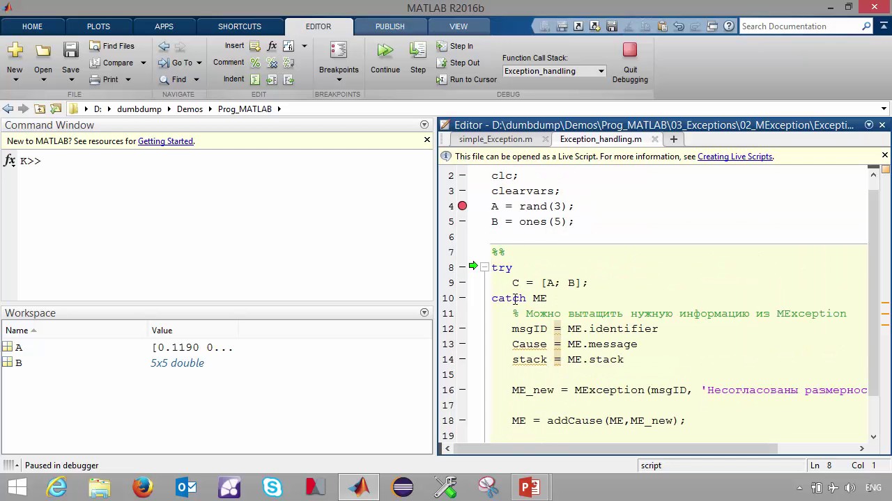Обработка исключений в MATLAB: Объект Mexception
