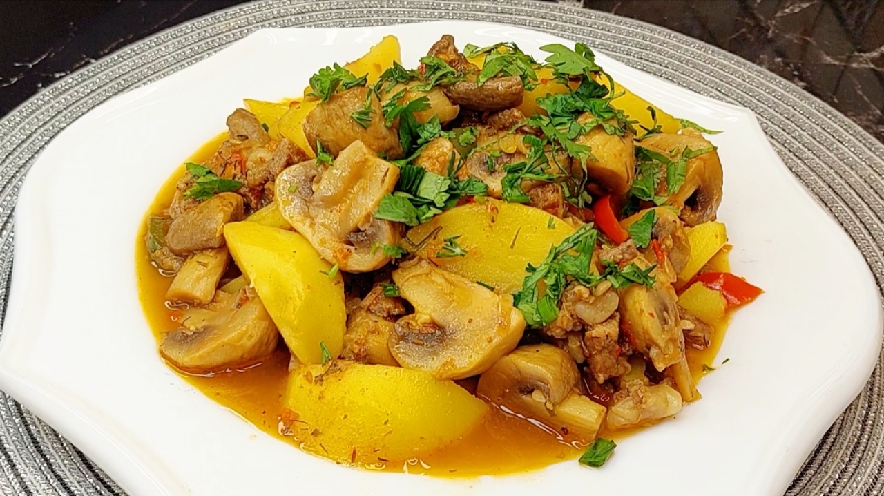 Мои секреты! Домашняя Простой рецепт блюда на каждый день Жареная Картошка с Мясом и Грибами