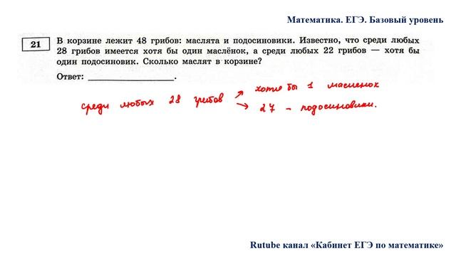 Задание 21. В корзине лежит 48 грибов: маслята и подосиновики. Известно, что среди любых 28 грибов имеется хотя бы один маслёнок, а среди любых 22 грибов — хотя бы один подосиновик. Сколько маслят в корзине? Курсы для подготовки к ЕГЭ по математике: https://stepik.org/users/608571559/teach Группа ВК: https://vk.com/secretroom2023