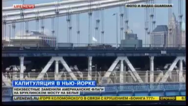 На Бруклинском мосту в Нью-Йорке вывешены белые флаги. Фрагмент информационного выпуска телеканала LifeNews от 23 июля 2014. #СШП #сша #моск #флаг #белый #капитуляция #капитулирует #бруклин