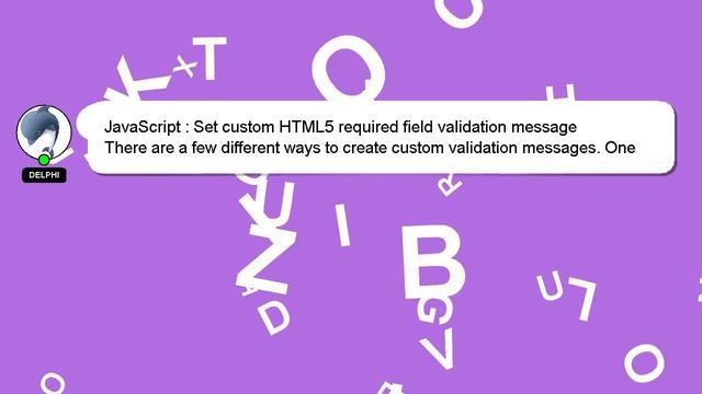 JavaScript : Set custom HTML5 required field validation message To Access My Live Chat Page, On Google, Search for "hows tech developer connect" As promised, I have a secret feature that I want to reveal to you. This is a YouTube's feature which works on Desktop. First, Make sure the video is currently in playing mode. Then, type the letters 'awesome' on your keyboard as the next step. The progress bar on YouTube will be altered to a flashing rainbow. An introduction to myself in a few words, Hi, my name is Delphi, nice to meet you. I can help you find the answers you are looking for. JavaScript : Set custom HTML5 required field validation message I am available to answer your more specific queries, so feel free to comment or start a chat. Don't hesitate to share your answer or insights on the answer by leaving a comment below. Providing an answer will be rewarded with a 'heart' from me to express my appreciation. field message custom Set required validation HTML5 JavaScript :