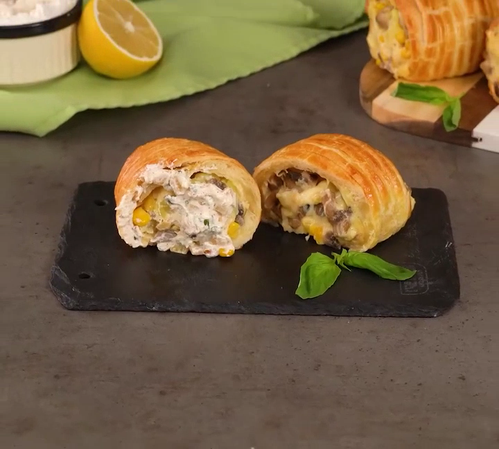 Мне даже соседи завидуют! Эта закуска покорит вас с первого раза! Ингредиенты: слоеное тесто: 700 г яйца : 1 шт. сыр : 150 г растительное масло: 20 мл грибы, шампиньоны : 300 г консервированная кукуруза: 200 г сливочный сыр : 50 г картофель : 300 г вода: 1 л НА СРЕДНИЙ ОГОНЬ: 15 МИН