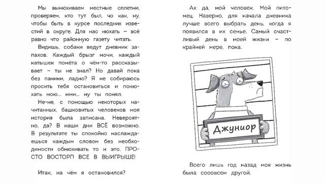 Давайте знакомиться! Я – Джуниор, невероятный оптимист и отчаянный нарушитель всех возможных правил. И это мой дневник. Первый в мире дневник … собаки! Да-да, мокрый нос, язык-лизунок, ушки-хлопушки, ррр-гав-тяф-тяф!.. Жизнь моя была похожа на рай: собственная уютная семейная конура с небольшим двориком, откуда можно облаивать птиц, енотов, белок, почтальонов и… я уже упоминал енотов?, друзья-товарищи, с которыми можно вдоволь наиграться в парке и, конечно же, игры и почесушки с самым распрекрасным и любимым питомцем Рафом. Но однажды всё перевернулось в нашем беззаботном мире – нам перешла дорогу она, эта злющая дрессировщица, миссис Стрикер. И вот уже мы с Рафом под страхом возвращения меня в приют вынуждены плестись в школу послушания и даже участвовать в конкурсе «Собачье шоу изящных манер»… Как вы думаете, кто победит? Ха! Захватывающе–хвостокрутительнейшая история, которая читается на одном дыхании, искромётный юмор и весёлые иллюстрации на каждой странице не оставят равнодушными ни одного любителя животных. Будет круто! Обнимашки! ОСТОРОЖНО: пробуждает интерес к самостоятельному чтению! Подробнее о книге и ссылки на покупку: https://go.ast.ru/a000wmk