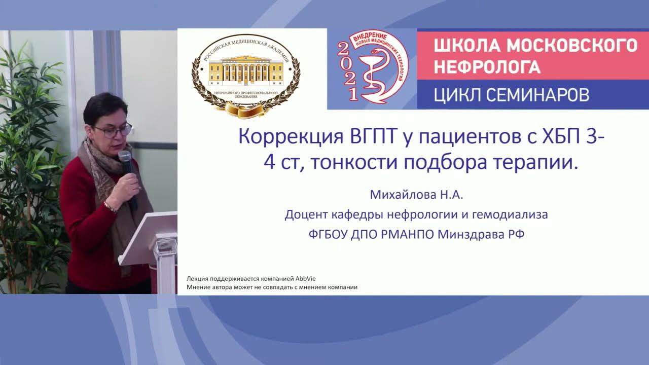Вторичный гиперпаратиреоз на преддиализных стадиях ХБП: почему важно начать лечение вовремя Лектор: Бондаренко Татьяна Витальевна, заведующая нефрологическим отделением ГКБ им. Ерамишанцева, врач нефролог высшей категории Коррекция ВГПТ у пациентов с ХБП 3-4 ст, тонкости подбора терапии Лектор: Михайлова Наталия Алексеевна, доцент кафедры нефрологии и гемодиализа ФГБОУ ДПО РМАНПО Минздрава России, врач – нефролог, к.м.н. Проект «Школа московского нефролога» Руководитель проекта: Котенко Олег Николаевич Организатор: Столичная Ассоциация Врачей Нефрологов https://nephro-portal.ru/ Информационно-технический исполнитель: ИнфоМедФарм Диалог https://imfd.ru/ Дата проведения: 24 ноября 2021 г. --- Нас можно найти: Сайт ‒ https://nephroliga.ru/ ------------------------------------------------------------------------------------------------- Facebook ‒ https://www.facebook.com/nephroliga.ru/ ------------------------------------------------------------------------------------------------- Instagram ‒ https://www.instagram.com/nephroliga/ ------------------------------------------------------------------------------------------------- Трансплантация? Я – за! ‒ https://donor4life.ru/ ------------------------------------------------------------------------------------------------- TransplantNet ‒ https://xn--80aa6ahcjekfi.net/info ------------------------------------------------------------------------------------------------- VK ‒ https://vk.com/nefropravo -------------------------------------------------------------------------------------------------