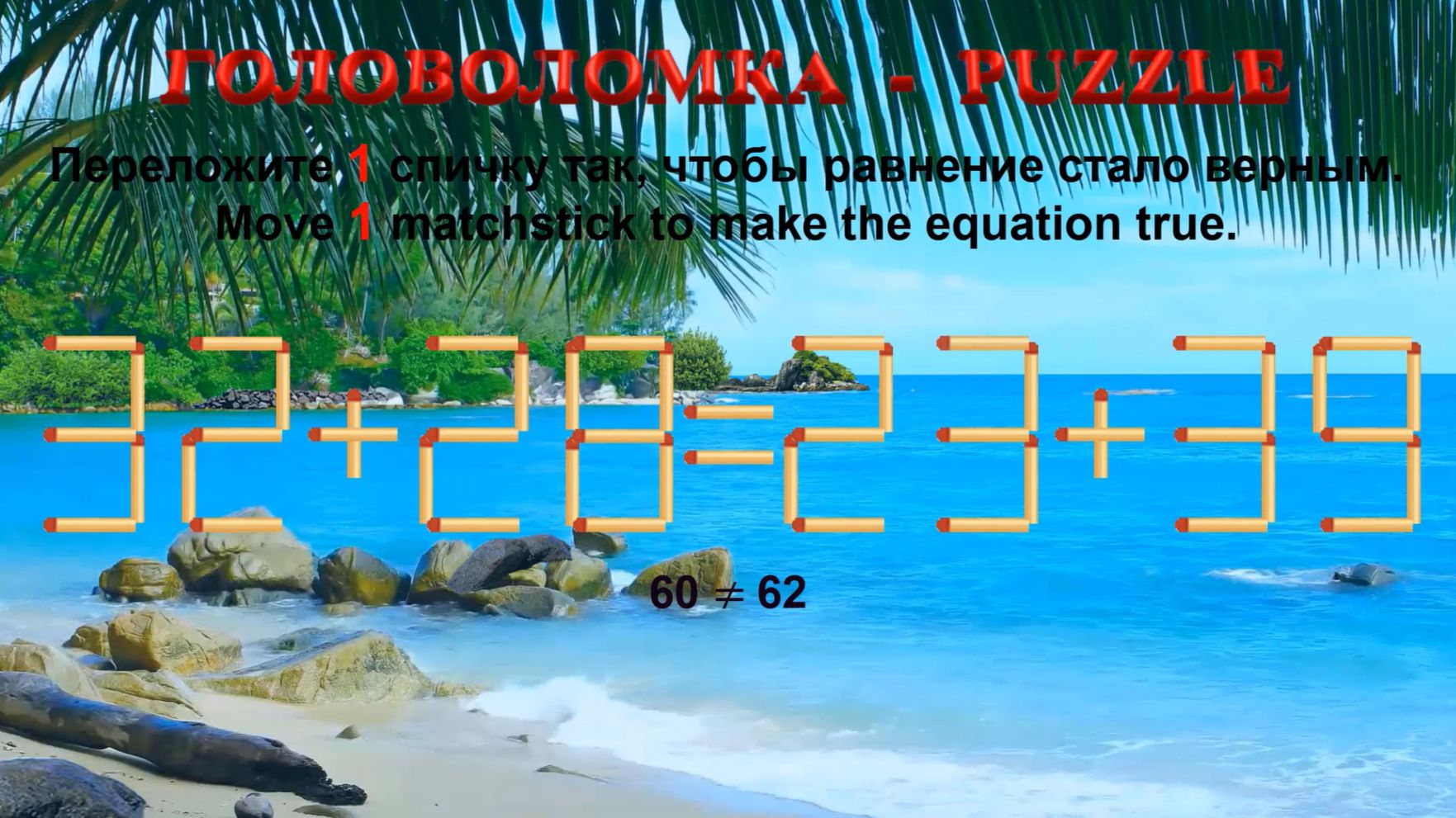 ГОЛОВОЛОМКА – PUZZLE. Спичка. 32+28≠23+39, 35+25≠28+35, 52+28≠56+23, 64+26≠58+24